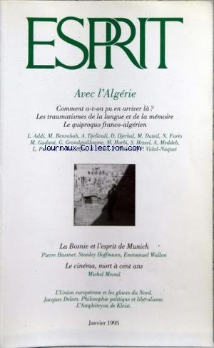 This book ESPRIT du 01/01/1995 - AVEC L'ALGERIE PAR ADDI - BENRABAH - DJELLOULI - DJERBAL - DUTEIL - FARES - GADANT - GRANDGUILLAUME - HARBI - HESSEL - MEDDEB - PROVOST - ROUADJIA - STORA - THIBAUD ET VIDAL-NAQUET - LA BOSNIE ET L'ESPRIT DE MUNICH PAR HASSNER - HOFFMANN ET WALLON - LE CINEMA - MORT A 100 ANS PAR MESNIL - L'UNION EUROPEENNE ET LES GLACES DU NORD- JACQUES DELORS - PHILOSOPHIE POLITIQUE ET LIBERALISME - L'AMPHITRYON DE KLEIST you must read.